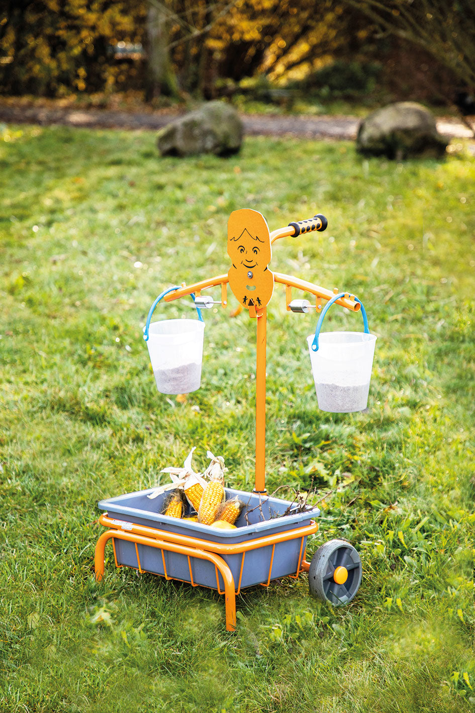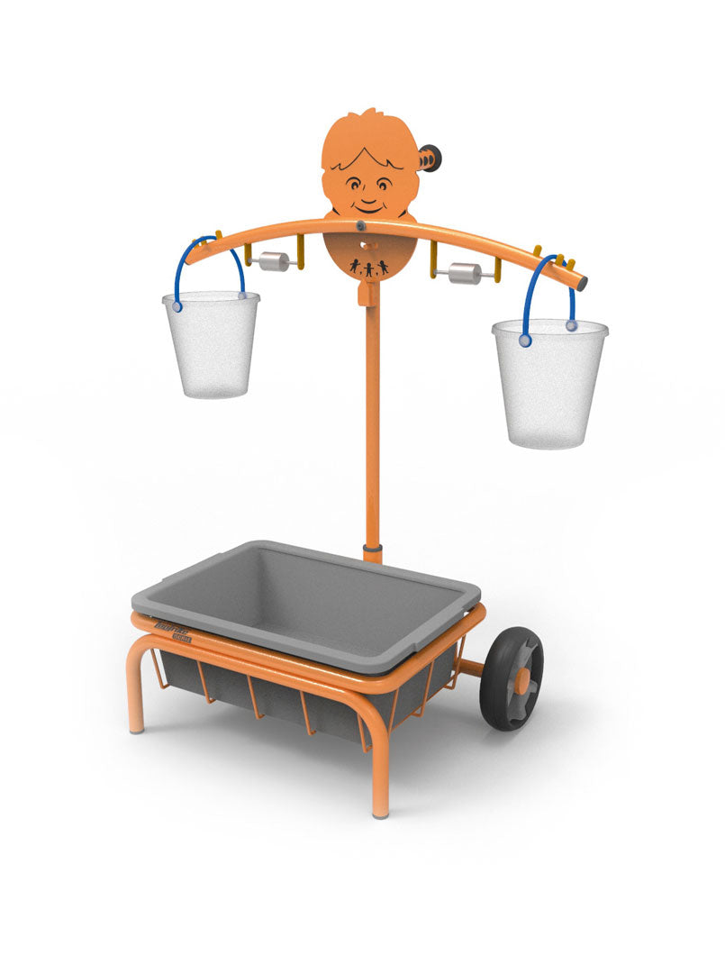 Auf jede Seite wird ein Eimer gehängt. Sind sie noch leer, kann die Balance mit den Ausgleichsgewichten eingestellt werden. Sie ist justierbar.