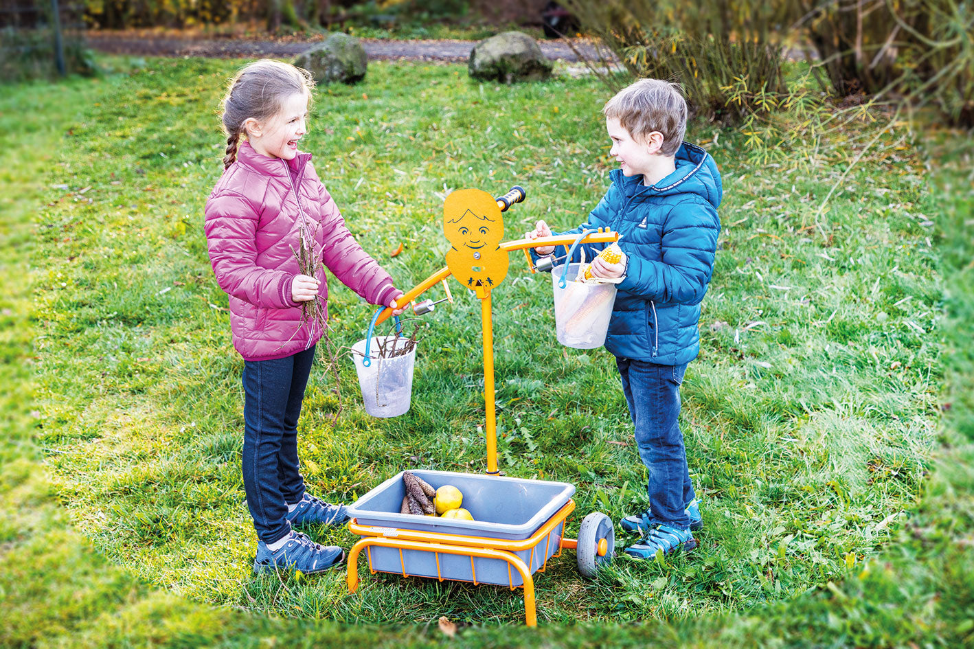 2 transparente Eimer sind im Lieferumfang enthalten, sie ermöglichen es den Kindern auch optisch Unterschiede zu erkennen. Es passen aber auch andere Eimer bzw. Netze, Beutel und dergleichen.