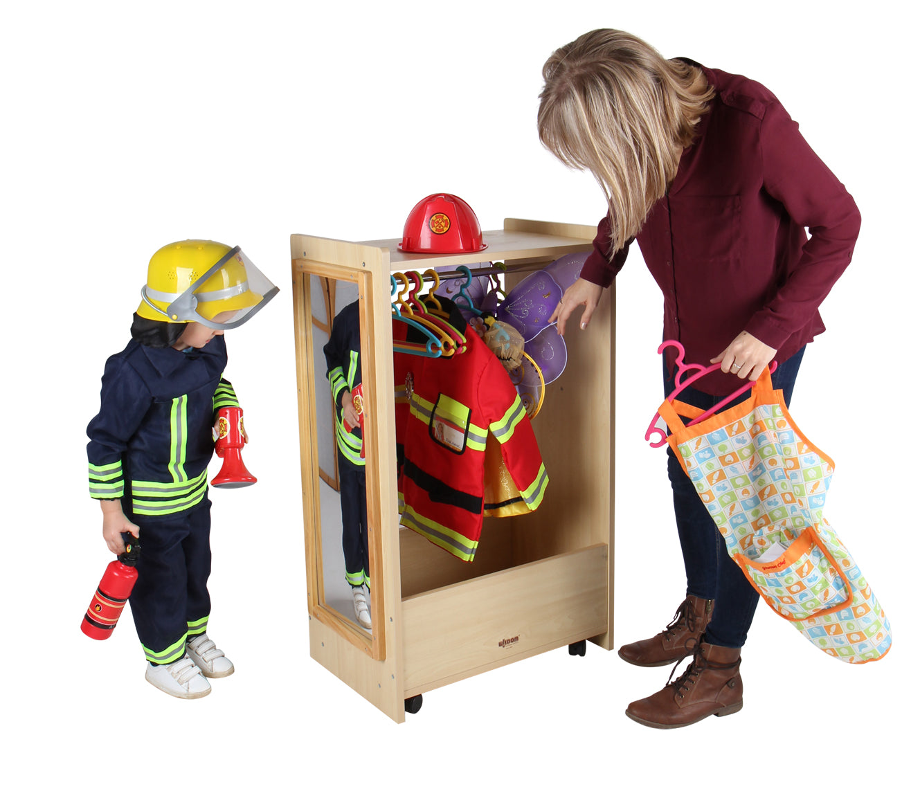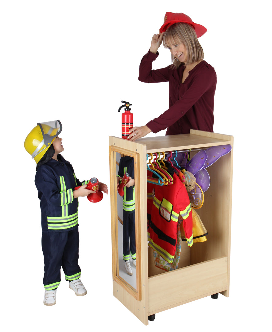 Der Kleiderwagen hat ein großes Ablagefach (oben), darunter eine stabile Metallkleiderstange und einen geräumigen Boden mit Seitenwänden zum Verstauen und Verräumen. Die 4 Rollen lassen den Wagen bequem und schnell durch die Kita, Gruppe, Flur schieben und ihn zu seinem Bestimmungsort fahren. Im Spiegel (Acryl) lässt sich dann das Kostüm und die Verkleidung bewundern.