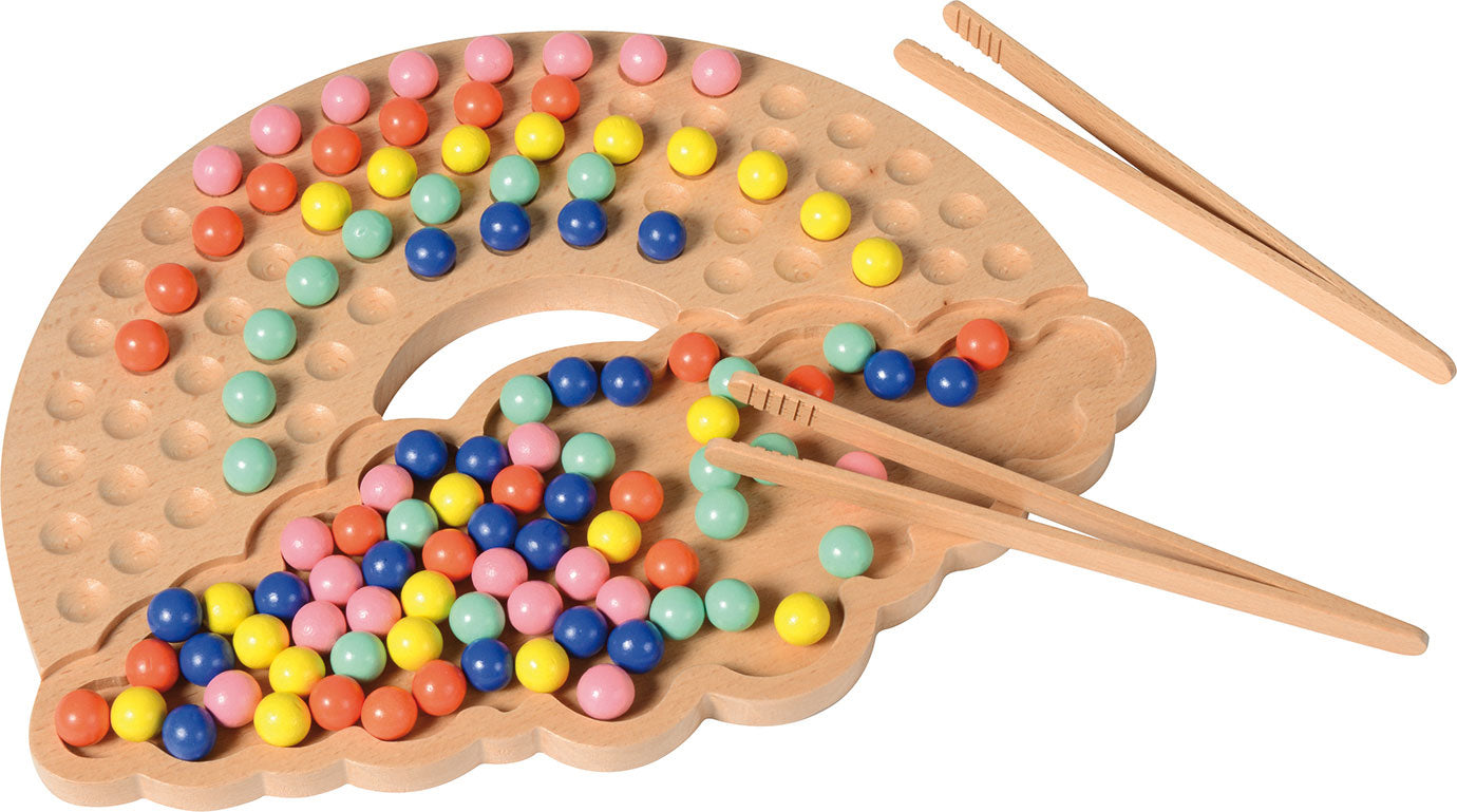 Ein bis zwei Kinder können das Spielbrett in Regenbogenform mit den bunten Holzkugeln befüllen oder farbige Muster legen.
