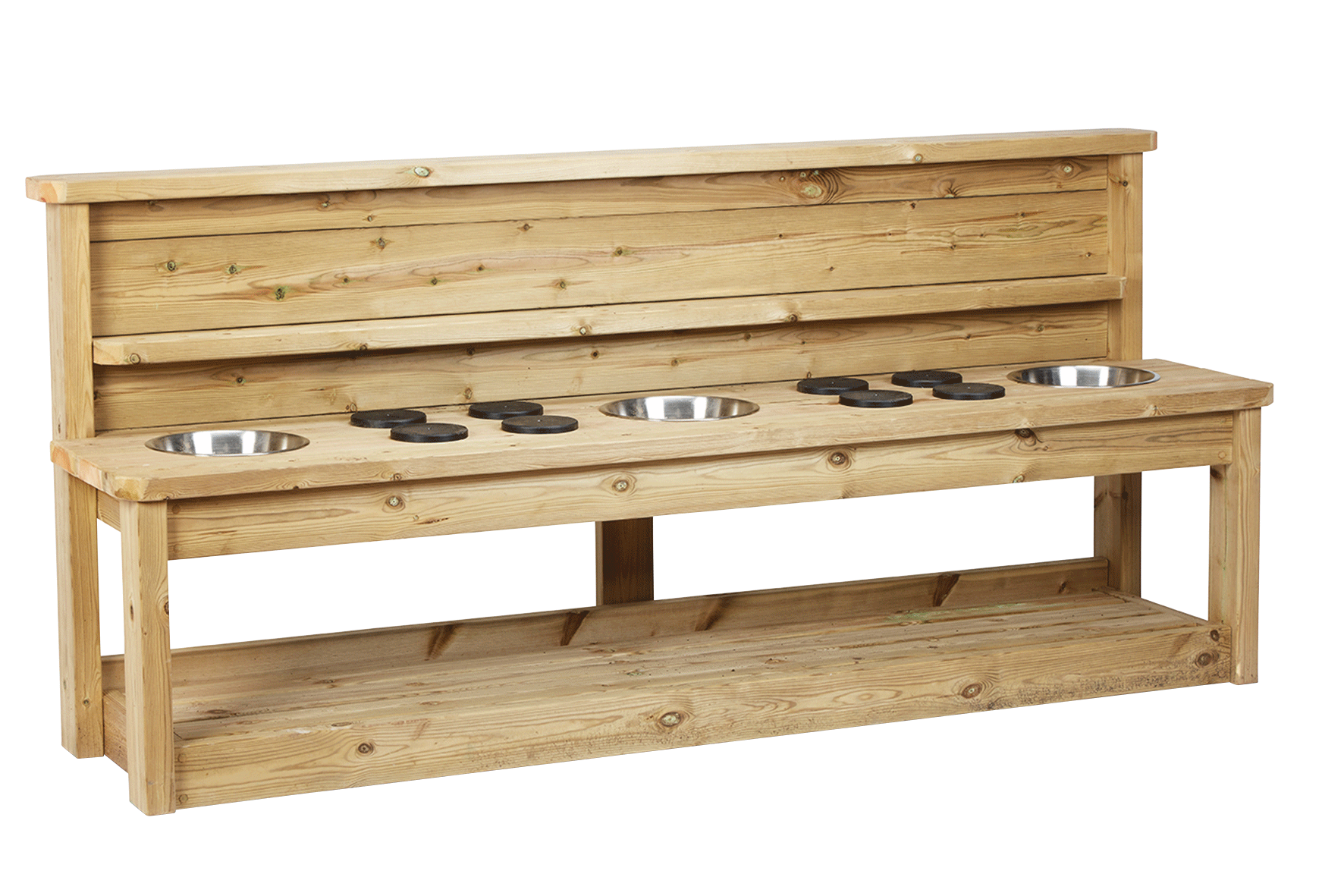 Robuste wetterfeste freistehende Outdoorküche. Auf 2 m Länge können mehrere Kinder gemeinsam kochen und matschen. Das Ablagebrett der Küche hat Bohrungen für Küchenutensilien. Die Küche hat abgerundete Ecken und steht sicher und fest. Ausgestattet ist die Matschküche mit 2 Herdfeldern und 3 Matsch- bzw. Spülschüsseln.