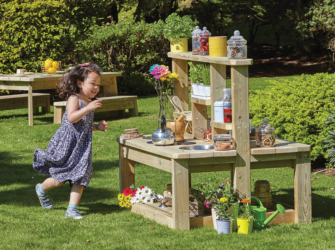 Robuste wetterfeste freistehende Outdoorküche als Inselküche. Hier können mehrere Kinder gemeinsam kochen und matschen. Die unteren Ablagebretter der Küche haben Bohrungen für Küchenutensilien. Die Küche hat abgerundete Ecken und steht sicher und fest. Ausgestattet ist die Matschküche auf einer Seite mit einem Herdfeld und 2 Matsch- oder Spülschüsseln.