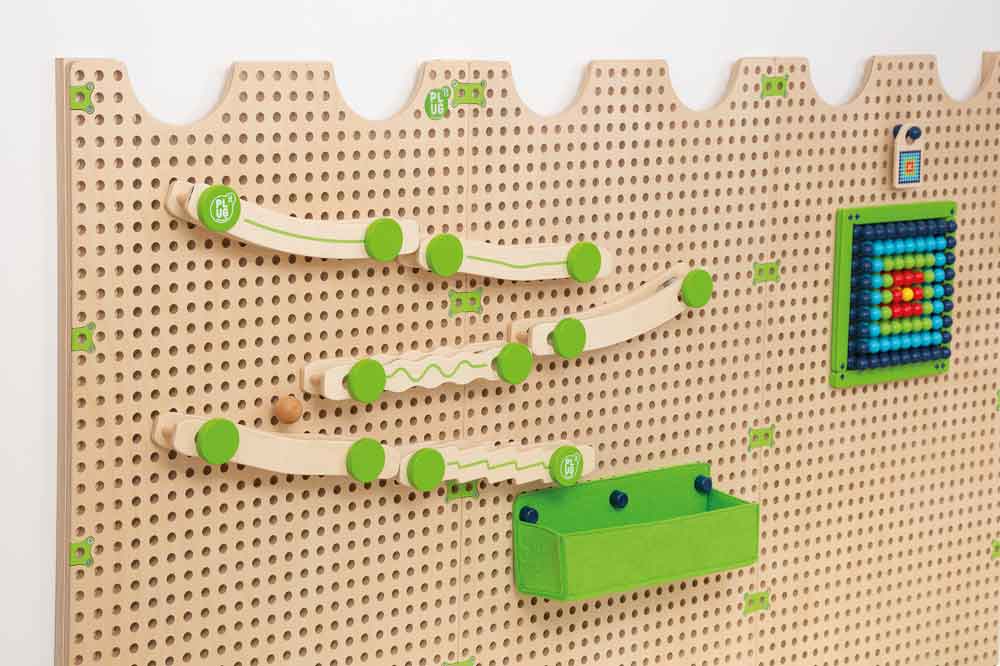 Aus den 4 unterschiedlichen Schienenformen entstehen endlos viele Kombinationen. Da die Kugeln auf beiden äußeren Rändern sicher rollen, nehmen sie nicht zu stark Fahrt auf. So können die Kinder die Kugeln mühelos mit den Augen verfolgen. Mit genügend Schwung „springen“ sie sogar auf die nächste Schiene. Aufgefangen werden die Kugeln in der praktischen, rechteckigen Filztasche der PLUG-it-Reihe (bitte separat bestellen), wo sie völlig lautlos landen.