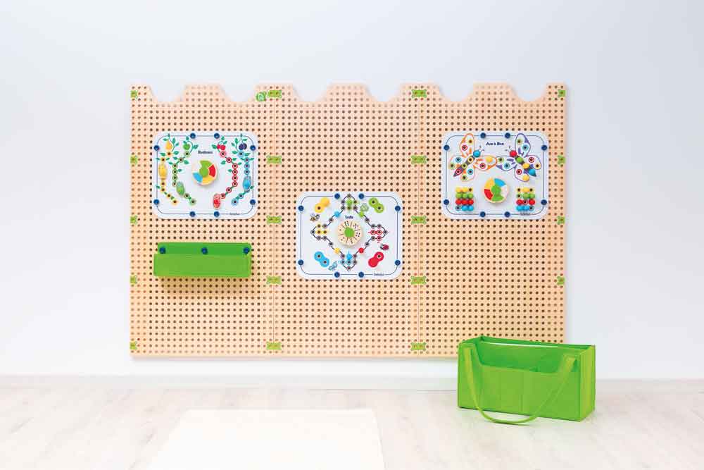 Täglich neues und kreatives Spiel ermöglichen. Kinder können die Elemente an der Wand nach Belieben in unterschiedlichen Höhen anbringen und somit ihre eigene Spielwelt gestalten.