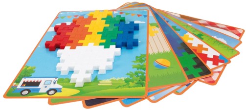 Die Kinder können die Bilder und Formen auf den Karten mit den Plus Plus BIG Steinen nachlegen.
