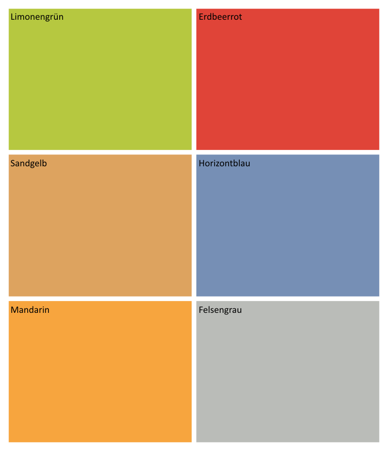 In den Farben Limonengrün, Erdbeerrot, Sandgelb, Horizontblau,Mandarine und Felsengrau, bitte bei der Bestellung mit angeben.