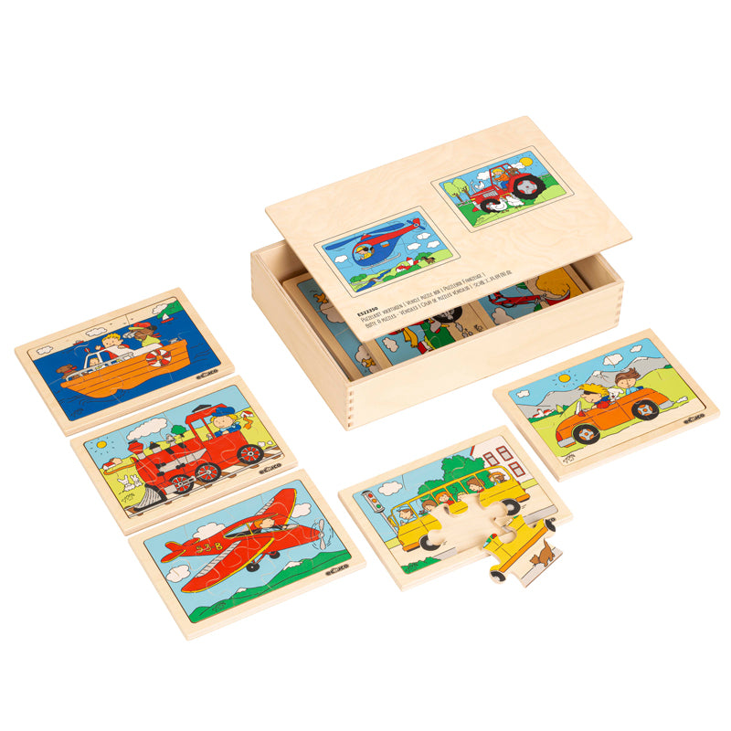 Aufbewahrungsbox mit Schiebedeckel inklusive 10 Holzpuzzles mit verschiedenen Fahrzeugmotiven. 5 der Puzzles bestehen aus 6 Teilen, die anderen 5 aus je 8 Teilen, die in einen Legerahmen eingelegt werden.