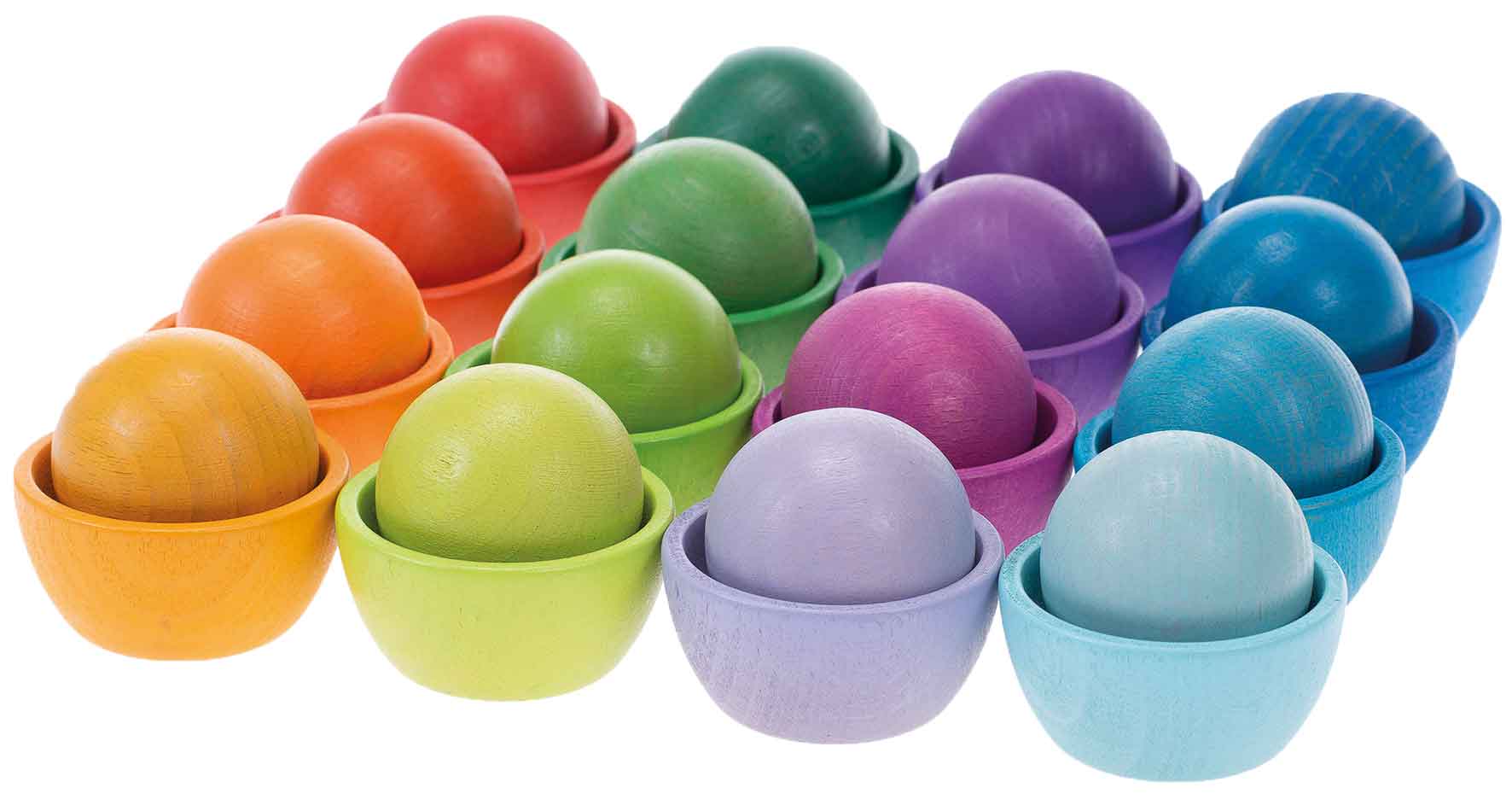 Die Echtholz-Regenbogenkugeln können die Kinder besonders gut greifen. Die dazu passenden Farbschalen können nun zu den farbgleichen Kugeln sortiert werden. Kognitiv werden Farberkennung, Motorik und Zuordnung geübt. 32-teilig Set, Buchenholz.