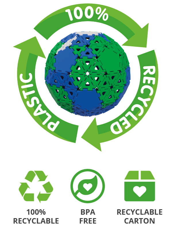 Die komplette Serie der Polydron-Baustein (Octoplay, Riesenpolydron, Polydron) ist nun aus 100 % Recycling-Kunststoff, BPA-Frei. Ebenso ist die Verpackung aus recyceltem Karton.