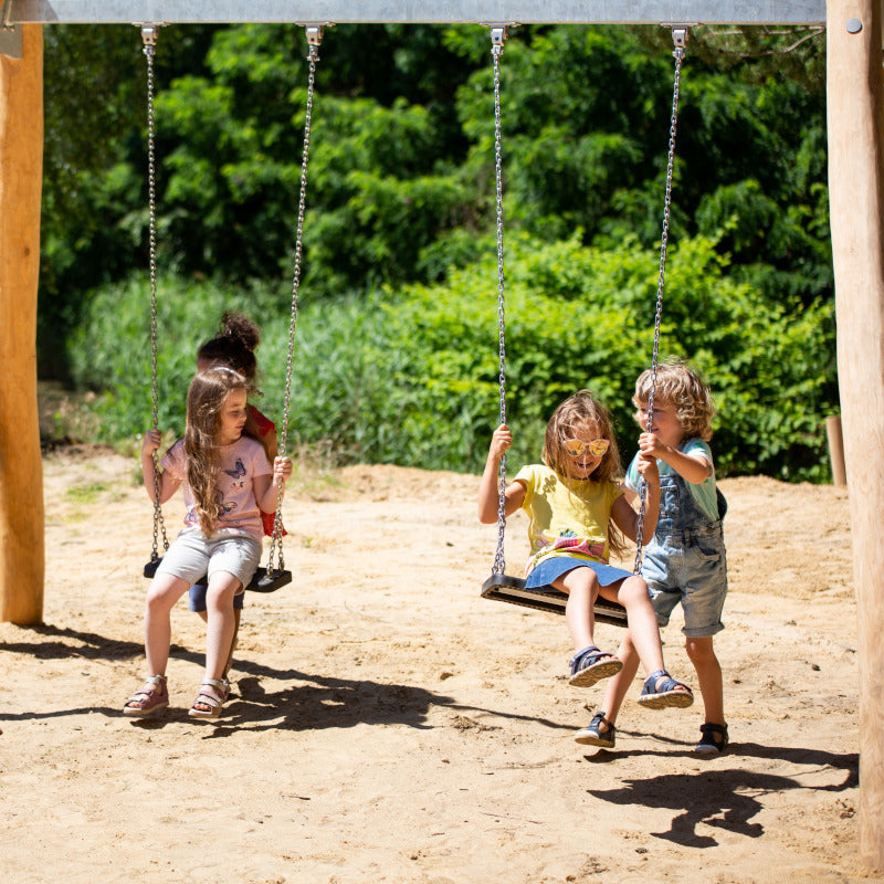 Die Konstruktion ist aus stämmigen Robinienholz mit einem Ø von ca. 18 cm.. Geprüfte, sichere Sitze. Die Ketten aus rostfreiem Stahl, die ein Einklemmen der Finger verhindern. Schaukelbeschläge aus rostfreiem Stahl.