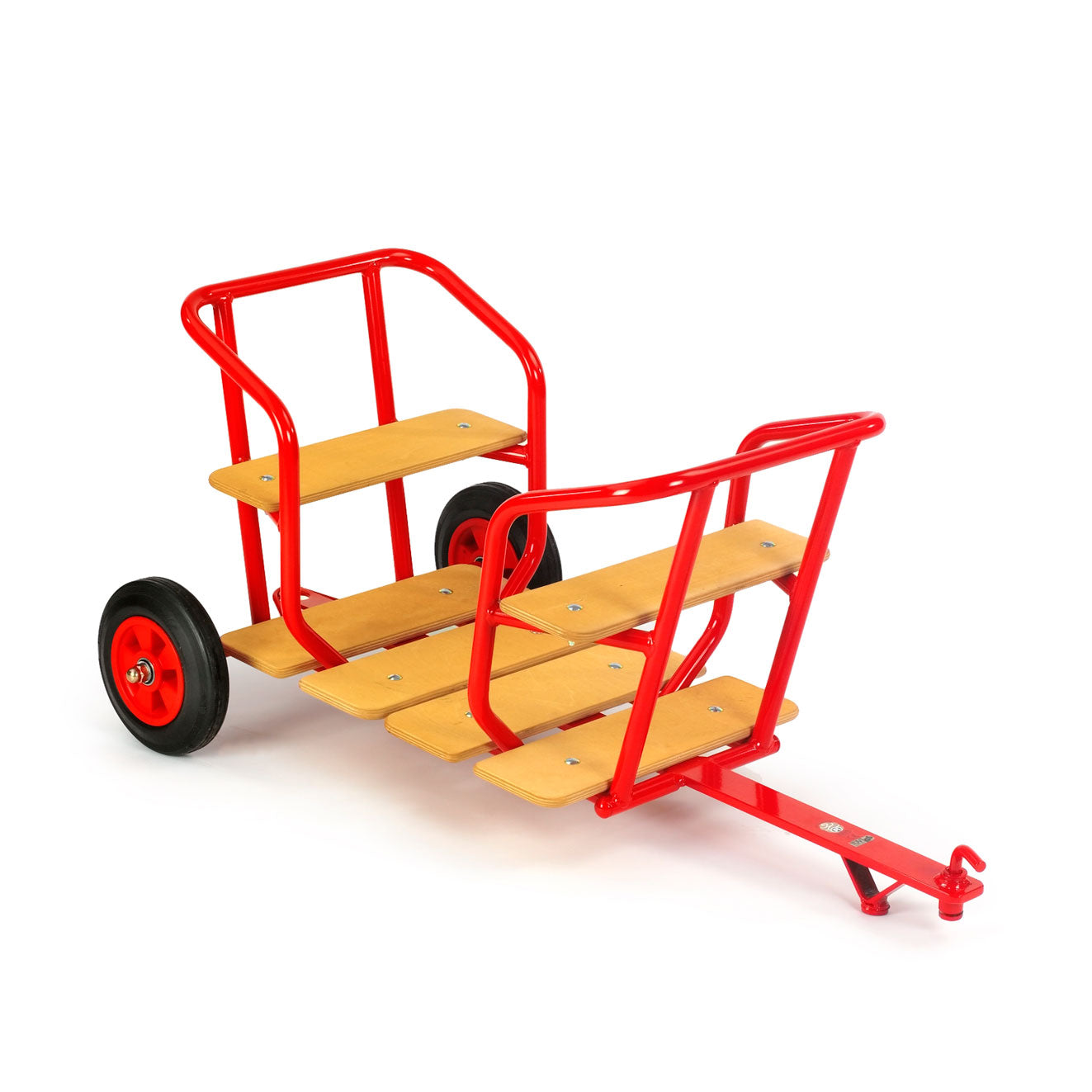 ROSE-Taxi-Anhänger mit zwei Sitzbänken zum Mitnehmen von zwei kleinen Passagieren. Der Einstieg auf die Plattform ist beidseitig möglich.