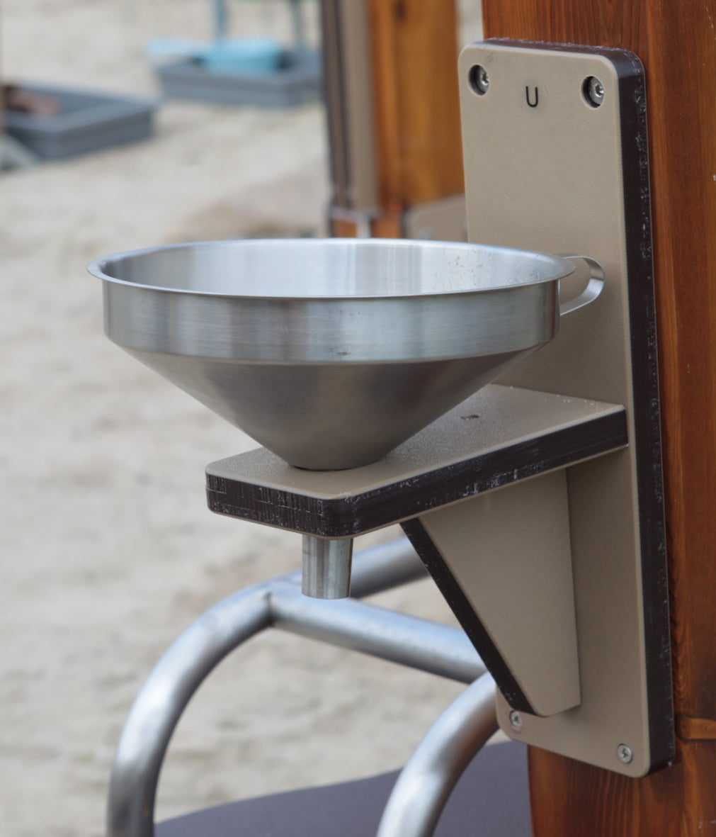 Dieser fährt den Sand dann direkt zur Mischanlage, die den Sand über den Trichter zurück in den Eimer befördert.