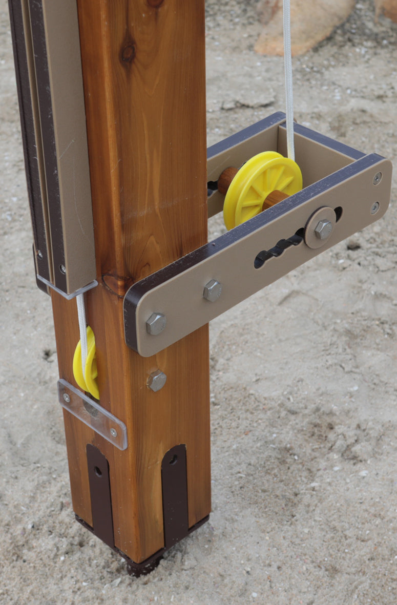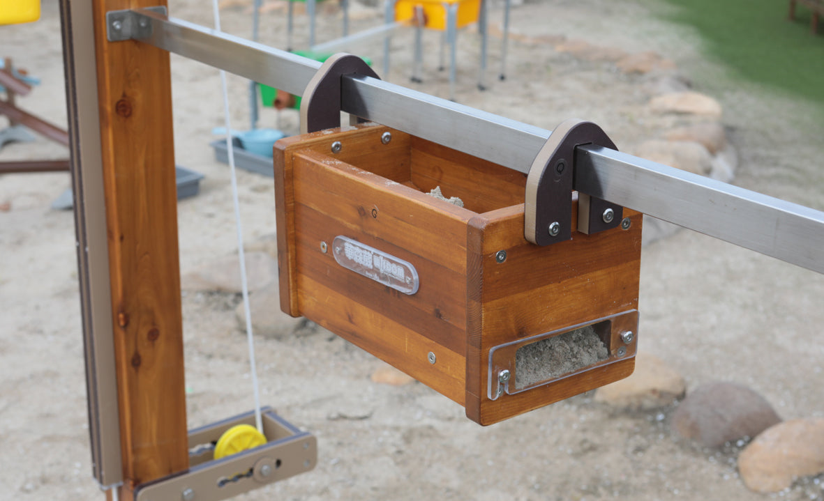 Mit dem Flaschenzug wird der Sand im Eimer nach oben befördert und dort in den Transportwagen umgeladen.