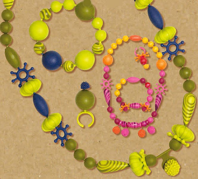 Die Teile sind einfach ineinander zu stecken oder zu fädeln, so dass die Kinder allein ihren eigenen Schmuck kreieren können.