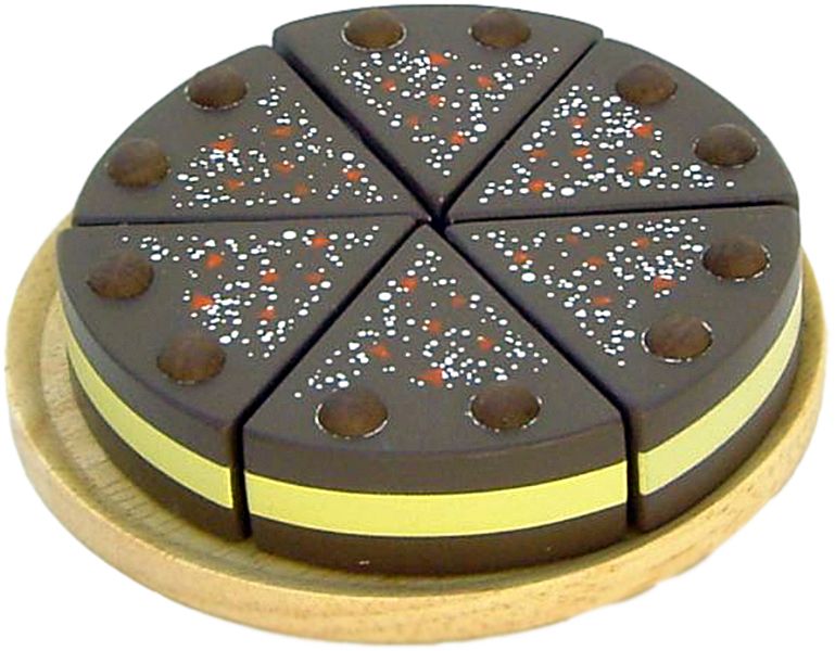 Die totale Verführung - Eine Schokoladentorte aus Holz auf einer Tortenplatte und einem Spielmesser. Für den Kaufmannsladen oder Kinderküche inklusive Holzmesser.