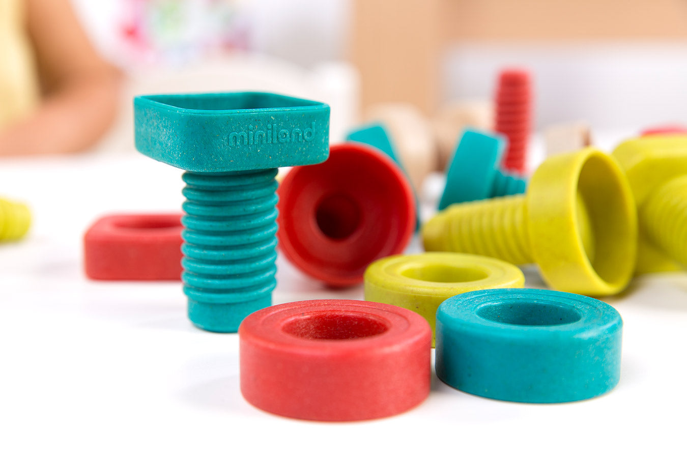Jetzt wird geschraubt! Das Auf- und Abschrauben verbessert die Geschicklichkeit und die visuelle motorische Koordination der Kinder.
