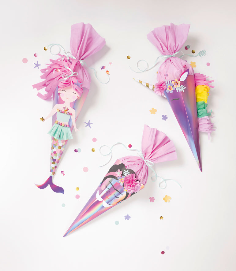 Sie haben die Wahl zwischen drei Motiven: Einhorn, Frida und Meerjungfrau. Oder lassen Sie Ihrer Fantasie freien Lauf und kreieren Sie Ihre ganz eigene Schultüte.