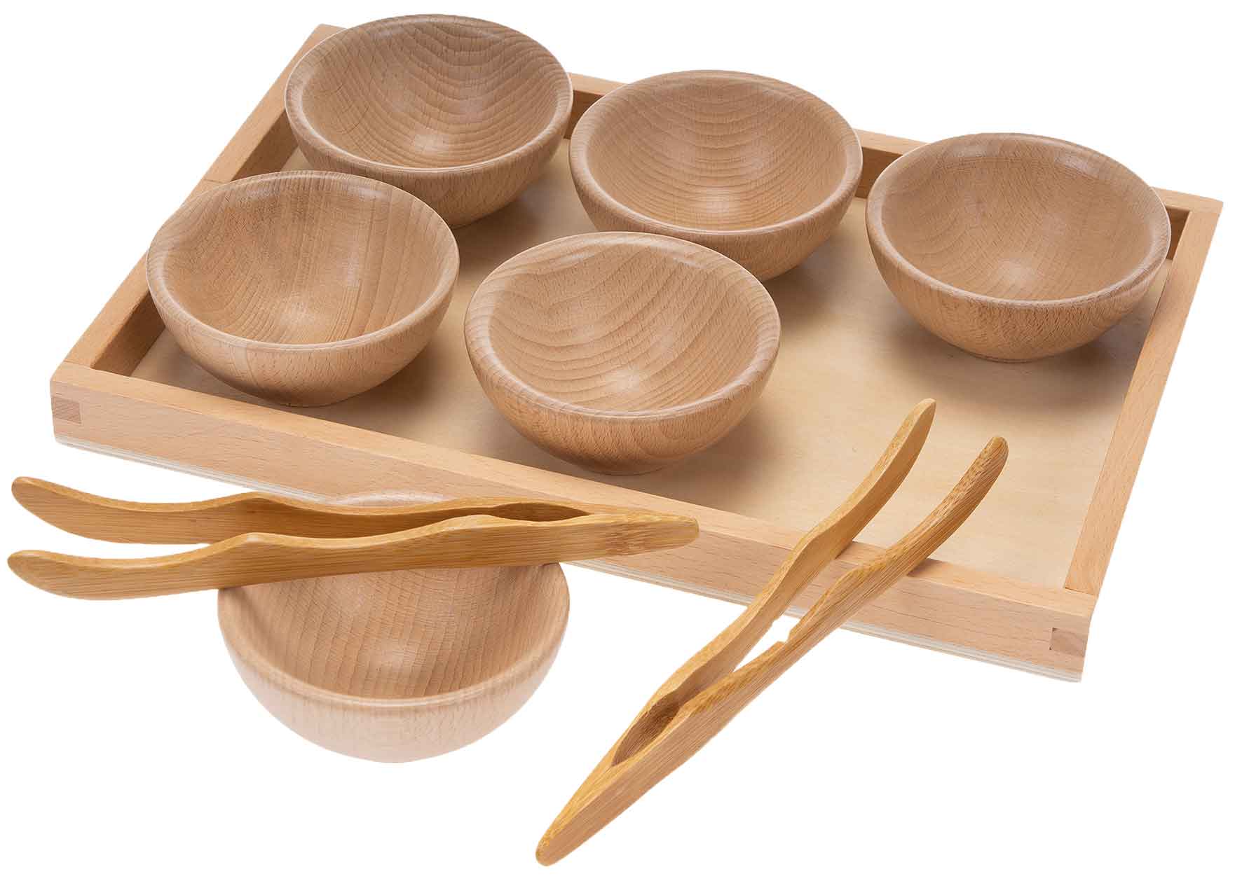 Ein Holztablett mit 6 schönen Schalen und 2 Pinzetten. Dieses formschöne Set ist aus Holz.