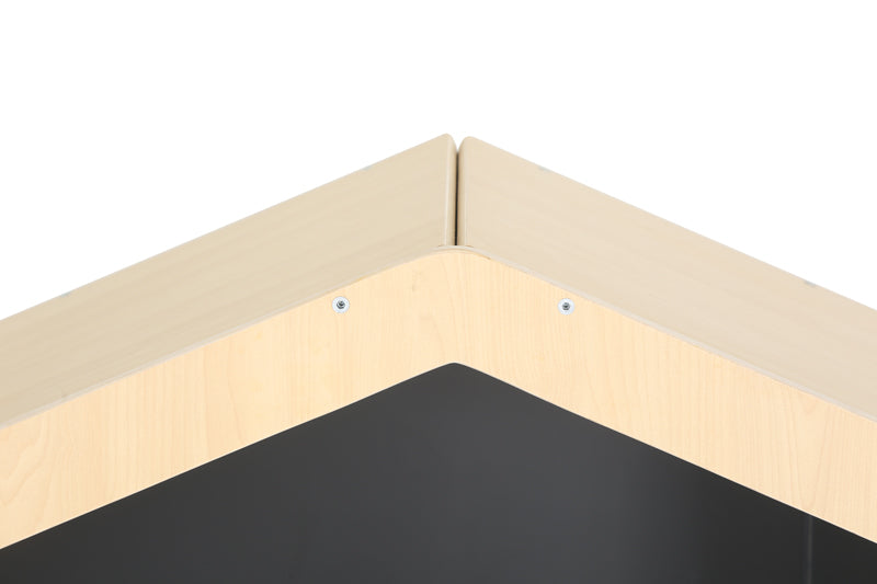 Je eine Seite ist mit einer schwarzen Kreidetafel und einem Spiegel ausgestattet. Um zusätzlich noch Stauraum für Spielmaterialien zu haben, befinden sich auf einer Seite drei Ablagefächer.