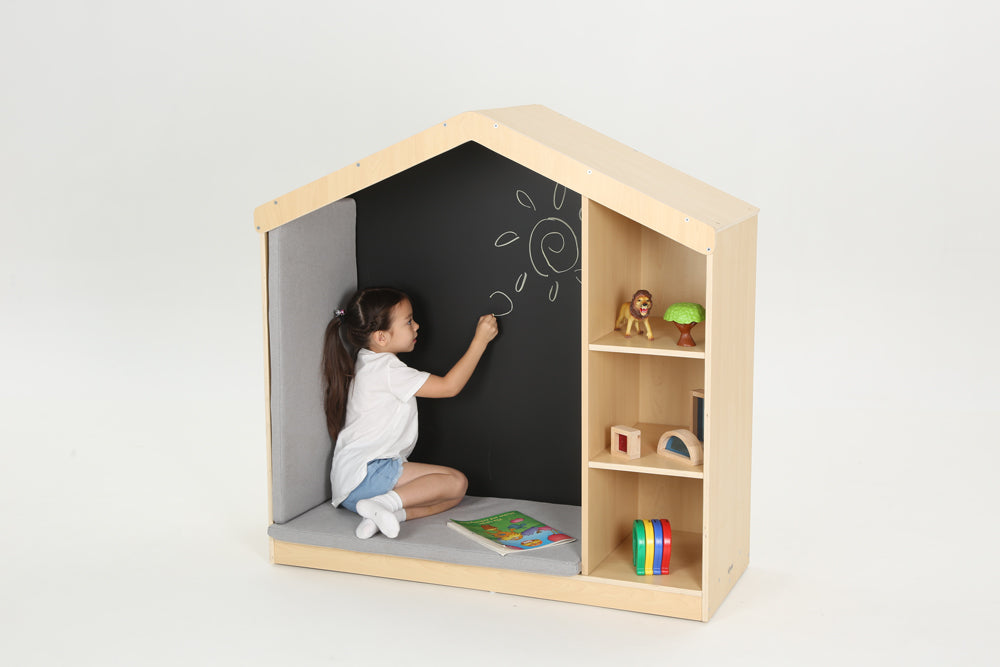 Einen gemütlichen Rückzugsort für Kinder bietet dieses Spiel- und Kuschelhaus. Bücher lesen, an der Kreidetafel malen oder sich selbst im Spiegel entdecken: das Kuschelhaus bietet zahlreiche Beschäftigungsmöglichkeiten.