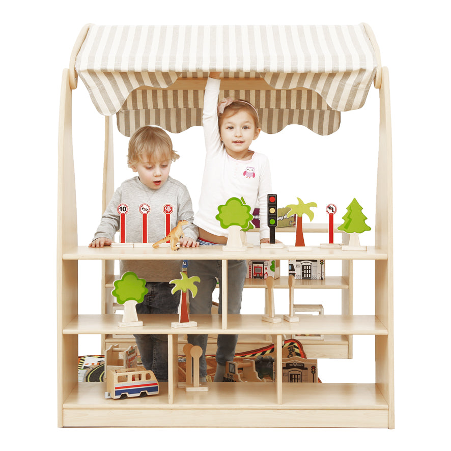 Das robuste Stoffdach und die 10 Ablagefächer für Spiele, Bücher oder Zubehör im Kaufladen oder Supermarkt gehört dazu. Die neutrale Gestaltung des Spielhauses lässt viel Freiraum für die eigene Kreativität und passende Dekoelemente. Schönes helles Holz (Multiplex mit Melaminbeschichtung in Ahornoptik.