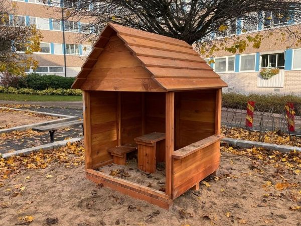 Kleines Spielhaus mit fester Sitzbank und festem Tisch.