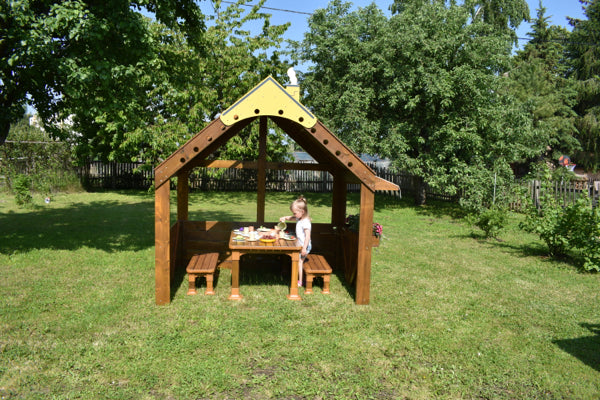 Ein Spielhaus mit Dachfenster und Seitenfenstern und großem Blumenkasten. Geräumig mit viel Platz für Tisch und Bänke oder für eine große Decke. Auch eine kleine Kinderküche hat darin Platz. Inklusiv dabei ist die wetterfeste Markise, Deko Schilder aus HPL für die Giebel, Kreidetafel außen und Blumenkasten. Lieferung ohne Sitzgarnitur.