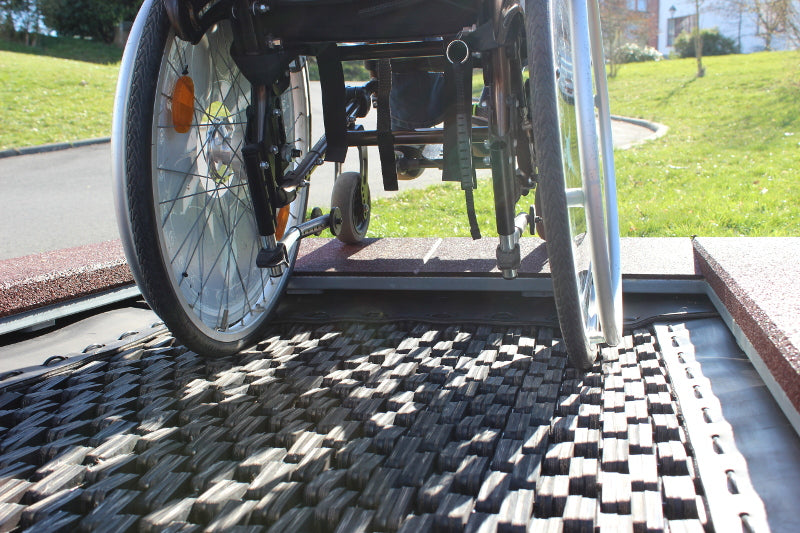 An den Schmalseiten mit innenliegender Rampe zum leichteren Befahren mit Rollstuhl.