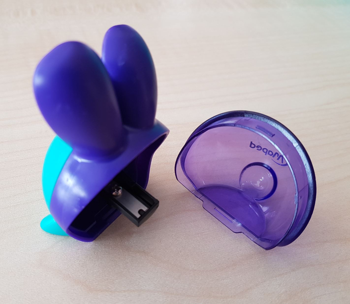 Lustiger Hasenspitzer für dünne Stifte mit max. Ø 8 cm. Wird der Stift im Uhrzeigersinn gedreht, bewegen sich die Zähne.