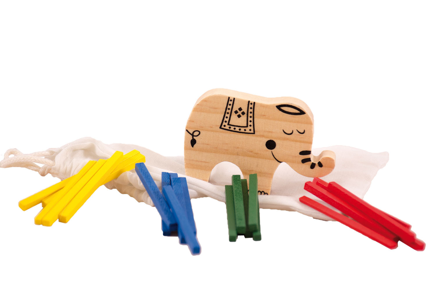 Mit ganz viel Fingerspitzengefühl sollen die vielen Stäbchen auf den Elefanten gestapelt werden, ohne dass dabei etwas herunterfällt.