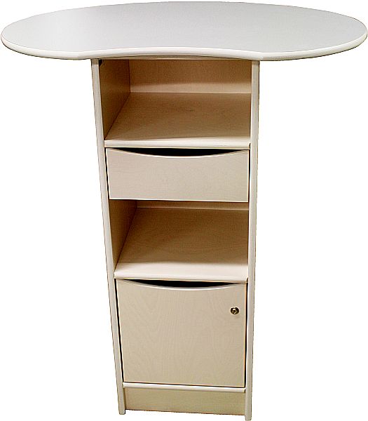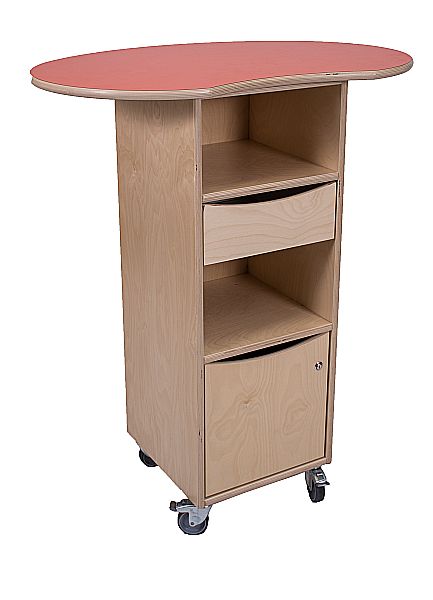 Ausgestattet mit Rollen, diese sind feststellbar. Die Tischfläche ist geschwungen um einen bequemen Stand zu gewährleisten.