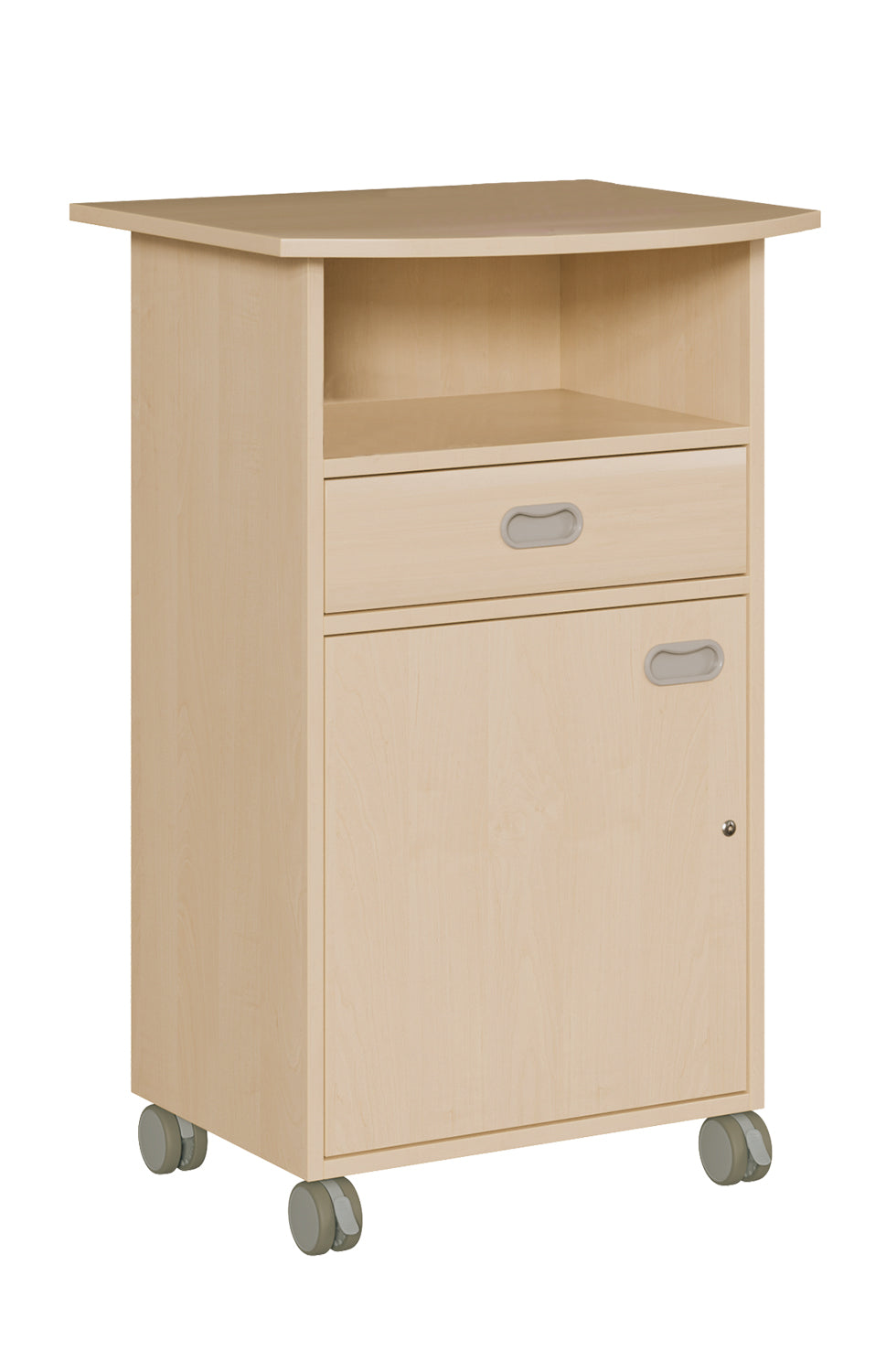 Es befindet sich ein Einlegeboden hinter der abschließbaren Tür, darüber ein Schub und ein offenes Fach.
