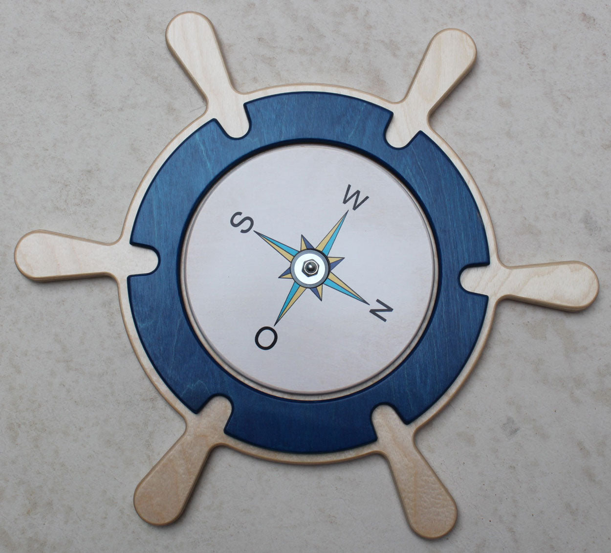 Wie auf einem richtigen Schiff. Das Steuerrad ist drehbar. Der Kompass auf dem Rad ist ebenfalls zum Drehen, so dass die Himmelsrichtung eingestellt werden kann.