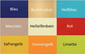 Sie können unter mehreren Dekoren (Buche hell und Birke) und unter 9 Stollenfarben (Hellelfenbein, Macciato, Safrangelb, Sonnengelb, Buche natur, Hellblau, Blau, Rot und Limette) wählen .