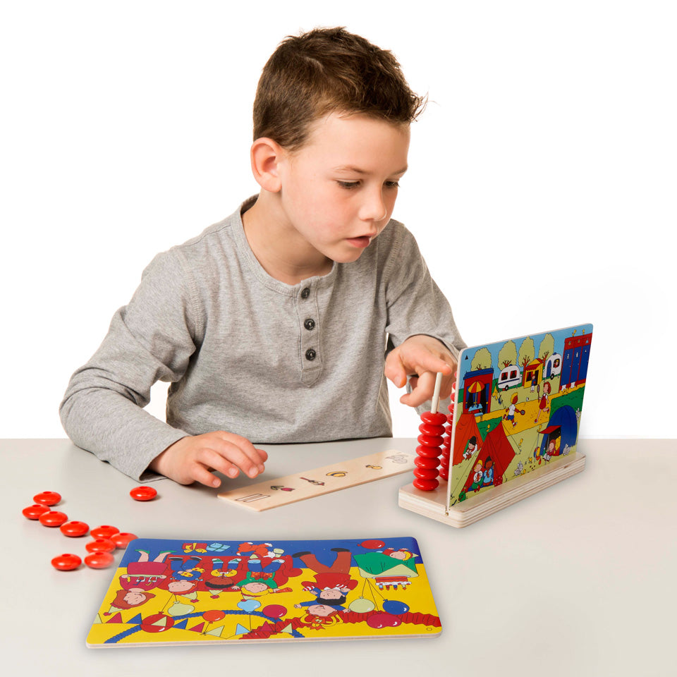 Inhalt: 3 Holzkarten mit 6 Themen, 6 Aufgabenkarten, 40 Zählsteine, Holzständer mit 6 Stäben, Anleitungsheft, Box mit Magnetverschluss
