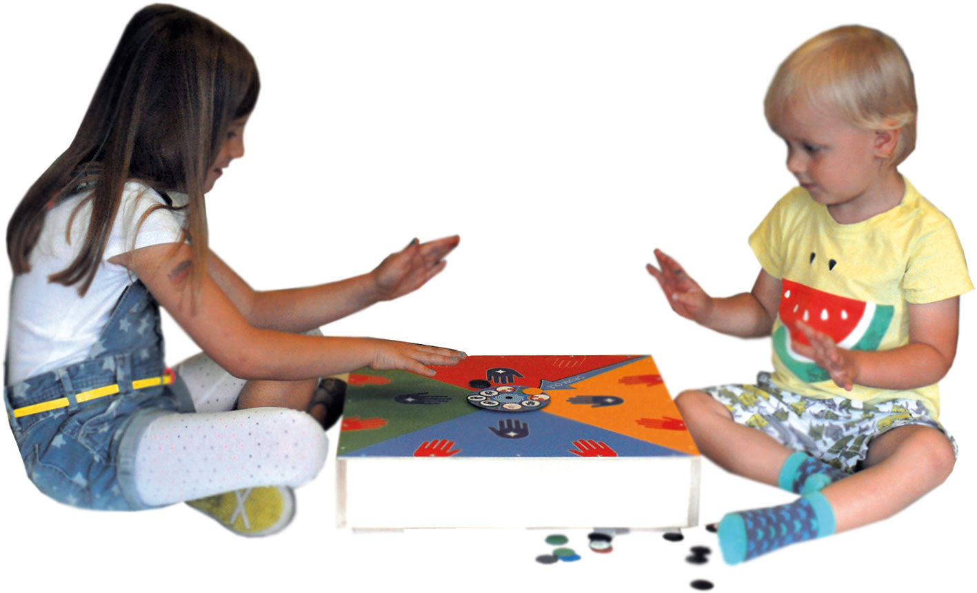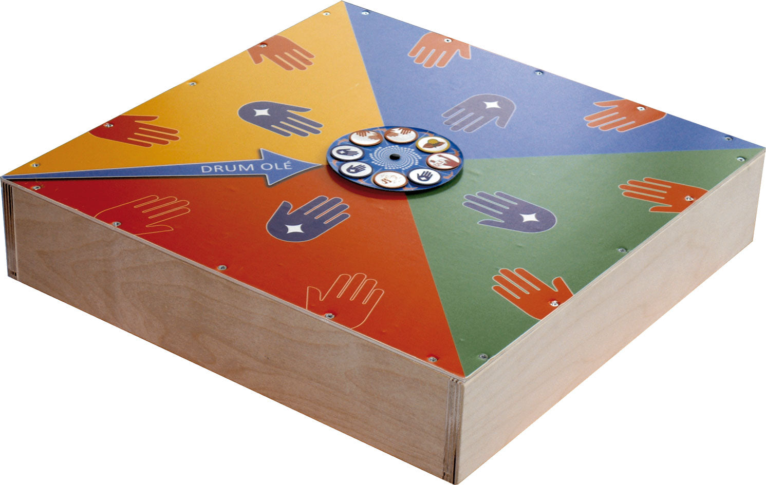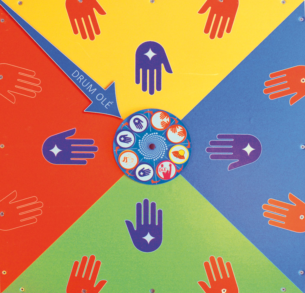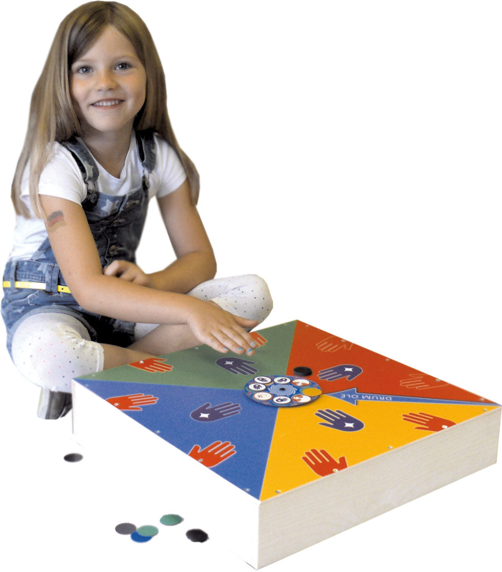 Großes Trommelspiel für 4 Mitspieler. Reihum wird getrommelt, geklatscht, geschnipst oder ist still – je nachdem was die Karte anzeigt.