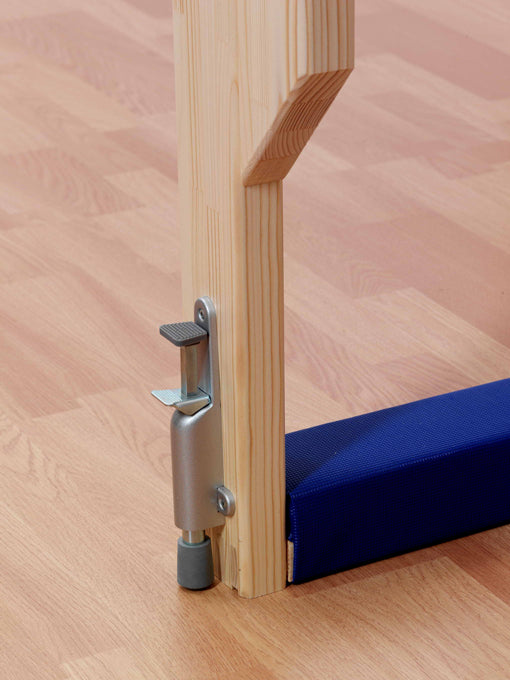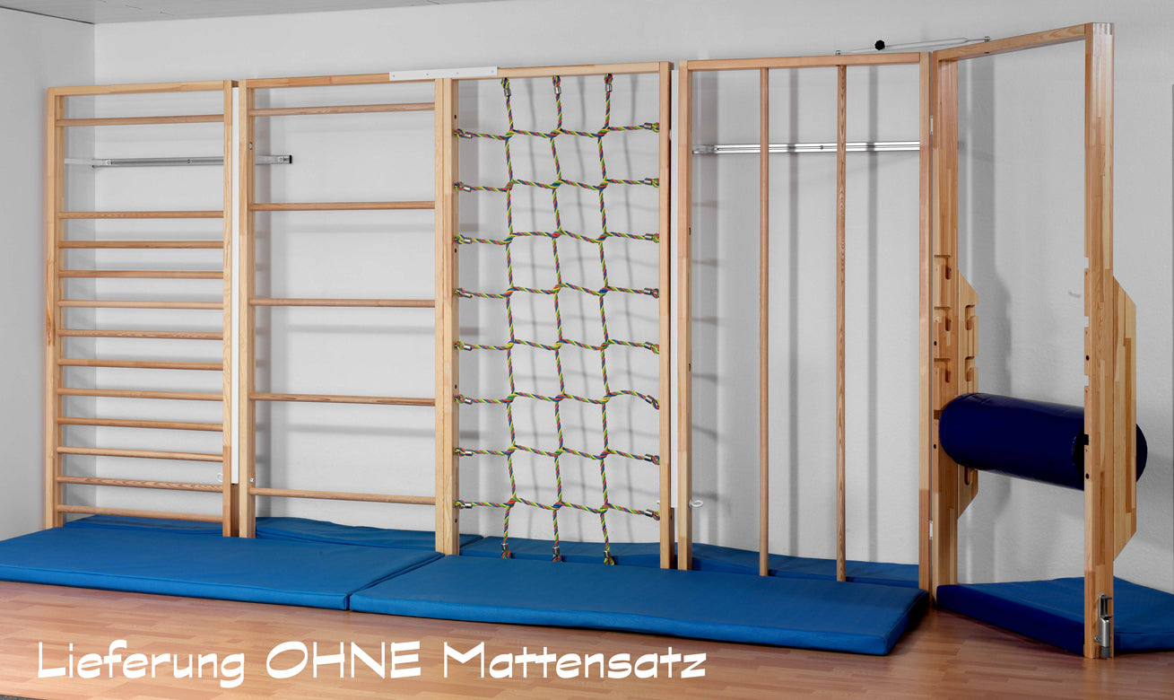 Die mittleren Elemente sind durch Führungsschienen und Arretierungsbolzen nach vorn in den Raum umklappbar. Dadurch sind 4 verschiedene Arretierungen möglich: senkrecht, 2 × schräg und waagerecht. Das Reck-/ Rollenelement lässt sich in den Raum klappen. Die Reckstange bzw. Turnrolle lassen sich in 4 verschiedenen Höhen einsetzen. Die Lieferung erfolgt mit komplettem Montagematerial für 40 cm Wandabstand (Die Befestigung erfolgt in der Wand und im Fußboden), inkl. Schwenkbeschlag. Die Lieferung erfolgt ähnlich Abbildung. Die Reckstange und die Turnrolle dürfen nicht gleichzeitig benutzt werden. Bei Fußbodenheizung bitten wir um Mitteilung. Die Umklappturnwand ist 5 m lang und 2,15 m hoch.