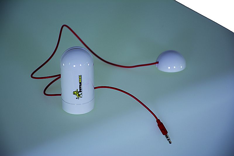 Heftet man den Sensor mit dem wiederverwendbaren PU-Aufkleber an den Hohlkörper, übertragen sich die Schwingungen und man hört die Musik wie aus einem Lautsprecher.