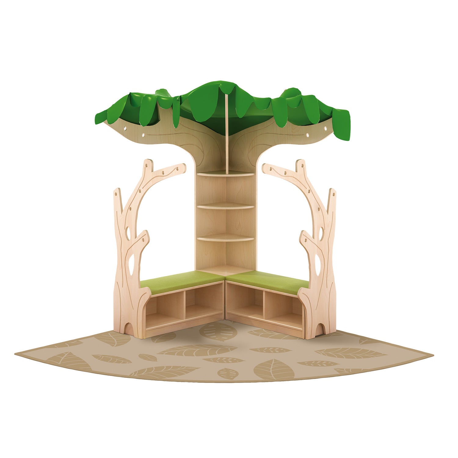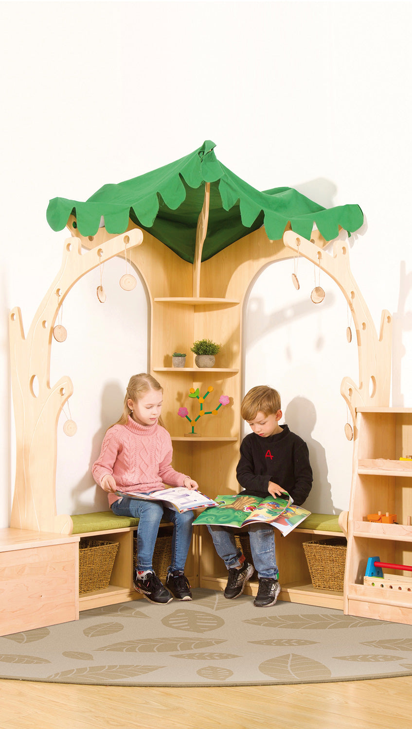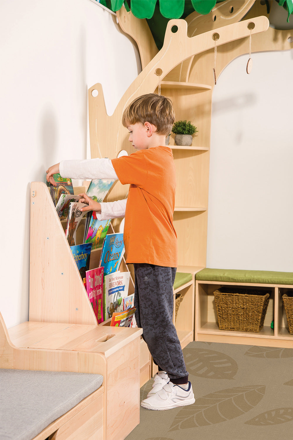 Diese Leseecke in Form eines Baumes ist ein Highlight für jeden Gruppenraum, denn das Bücherregal kombiniert ausreichend Stauraum mit gemütlicher Sitzlandschaft. Ideal für den Morgenkreis oder als Rückzugsort, um in Büchern zu stöbern.