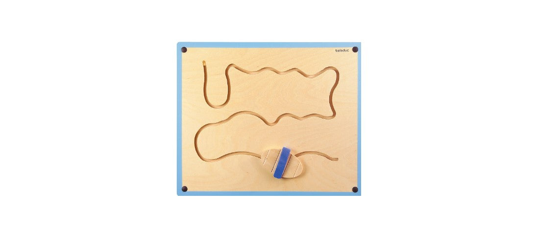 Bei diesem Wandspiel sind die Bahnen eingefräst. Die Kinder sollen ihren Fuß oder die Hand in die dafür vorgesehenen Schlaufen des Schiebeelements stecken und mit diesem dann den Bahnen folgen. Dabei soll die Bewegung möglichst fließend erfolgen.
