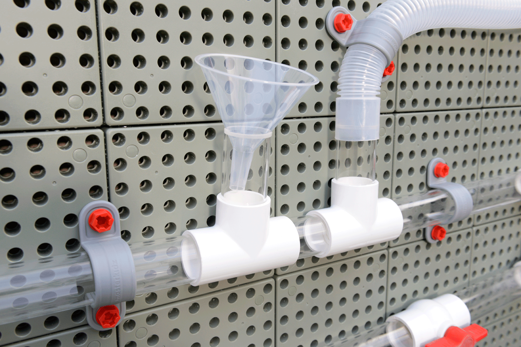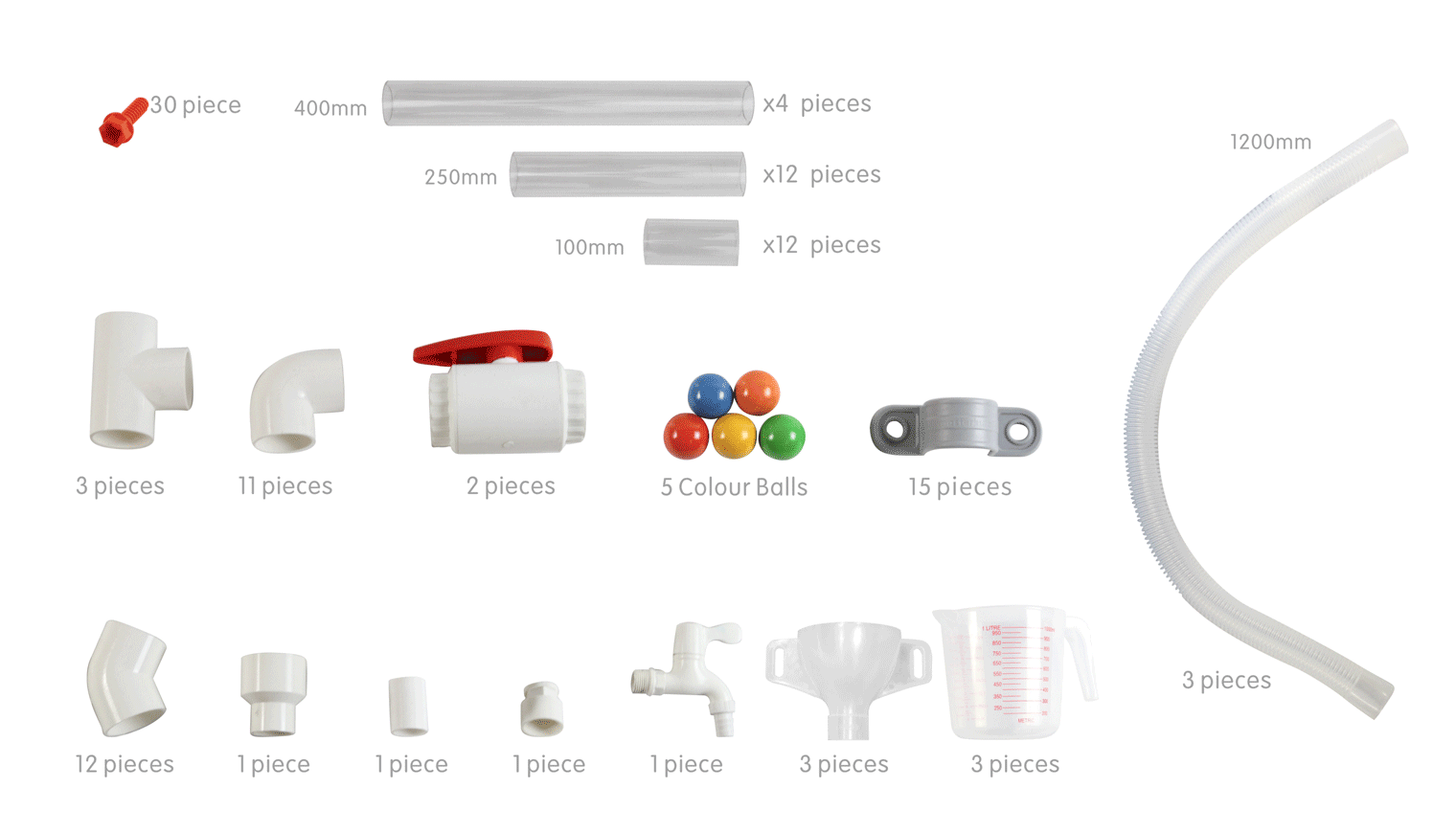 Es enthält durchsichtige starre und flexible Kunststoffrohre sowie eine Auswahl an Befestigungswinkeln (mit Schraubverbindungen), Absperrventilen, Biegungen (90 und 135 Grad), T-Verbindungen, einen Wasserhahn, Ausgießbecher, Trichter und 5 bunte Bälle. Das 119-teilige Set enthält eine größere Auswahl an Teilen und ein paar zusätzliche Komponenten, um komplexere Kugelsysteme zu bauen. Hinweis: Sieh dir die Liste der einzelnen Teile unter jedem Bausatzcode an. Mit den Rohrbausätzen können Kinder coole Wasserrutschen oder Kugelbahnen bauen und diese an jeder STEM-Wand befestigen. Sie können verschiedene Strecken entwerfen, planen und bauen und dann staunen, wenn sie diese testen und anpassen, damit Wasser oder Kugeln unter der Schwerkraft nach unten fließen. Es macht großen Spaß, zu sehen, wie die Dinge durch die kristallklaren Rohre fließen, die Betten und T-Verbindungsstücke passieren - echte Technik und Ingenieurskunst in Aktion. Ventile lassen den Wasserfluss öffnen oder stoppen ihn, sodass man sehen kann, wie sich Wasser staut. Diese Sets bieten Kindern tolle Möglichkeiten, in kleinen Gruppen zu bauen, zu diskutieren und ihre Entwürfe zu verändern. Zusatzkomponente: Sehr empfehlenswert ist eine funktionierende Wasserpumpe (ME13149), die separat erworben werden kann, um das Wasser wieder an den Anfang der Bahn zu pumpen.