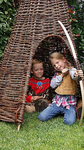 Die Stahlstreben ragen unten so ca. 10 cm heraus. Einfach in den Boden drücken und das Weidentipi hat genügend Stabilität.