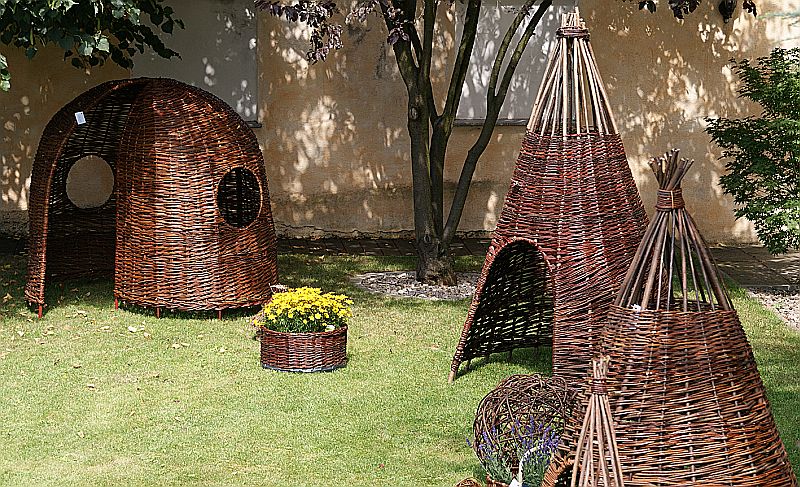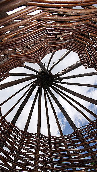 Das Geflecht des Weidentipies besteht aus unbehandelten und ungeschälten Weiden , die auf einen stabilen Stahlgestell verflochten sind.