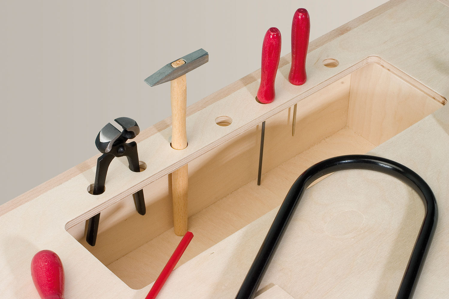 Ablagefläche unterhalb der Tischplatte, Bohrungen zur Werkzeugaufbewahrung, versenktes Ablagefach 38 x10 cm, ohne Werkzeug.