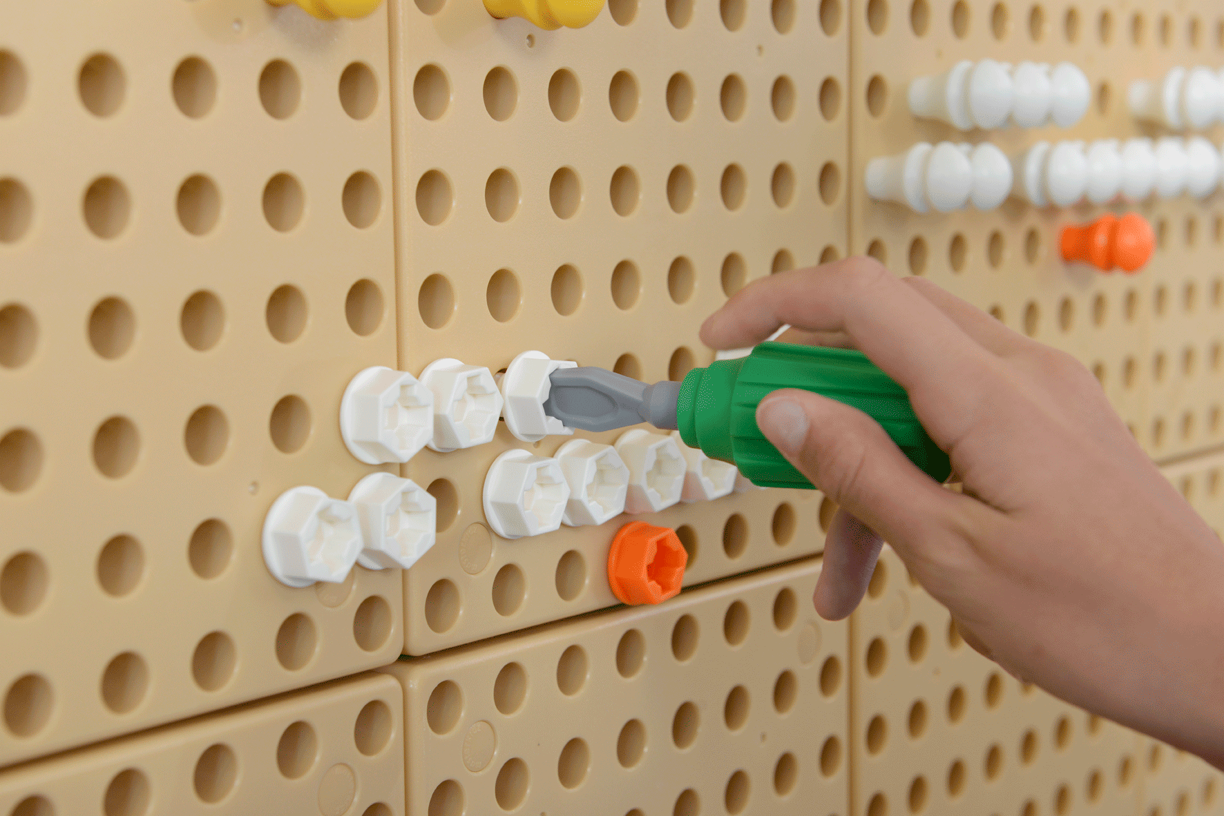 Kinder lieben es ... das Verhalten von Erwachsenen nachzuahmen, und dieses Set bietet Kindern die Möglichkeit, ein echtes batteriebetriebenes Handwerkzeug zu benutzen. Es ist ergonomisch geformt, passt gut in Kinderhände und verfügt über einen Ein-/Aus-Schalter mit Auslöser. Das Handwerkzeug ist sofort einsatzbereit für Kinder ab 3 Jahren. Das Befestigen von Schrauben an der STEM-Wand oder am Tisch wird noch einfacher, macht aber mehr Spaß und ist spannender. Das Set enthält Handwerkzeuge, einen batteriebetriebenen Schrauber und einen Werkzeugorganizer aus Buchenholz, der an die STEM-Wand befestigt werden kann.
