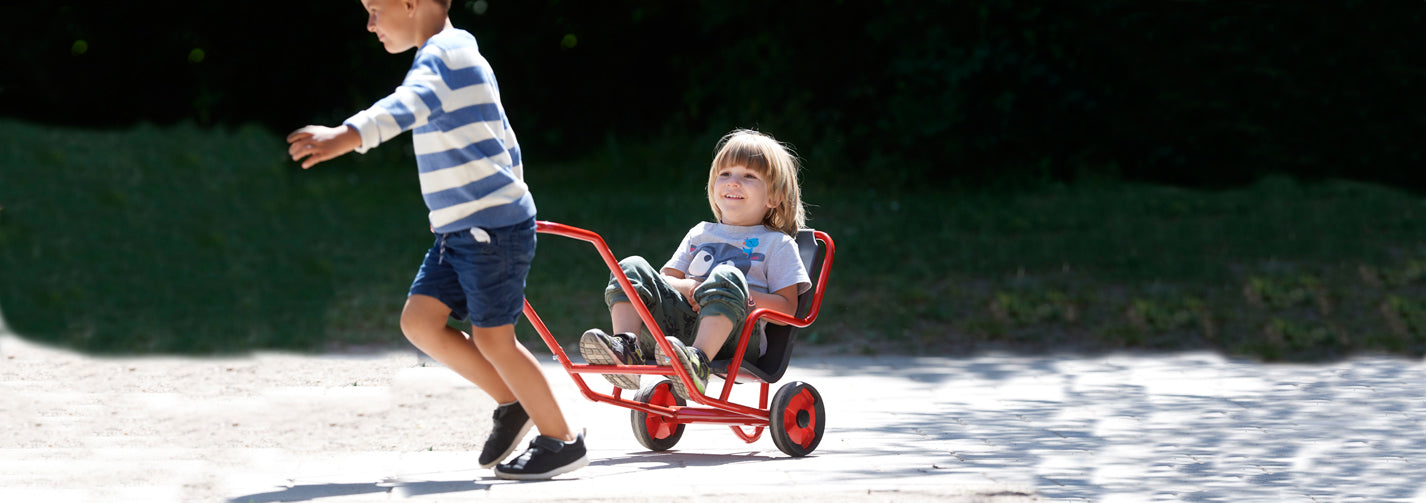 Ein Kind sitzt im Sulky und lässt sich ziehen – wer spielt Passagier und wer lässt sich einspannen?