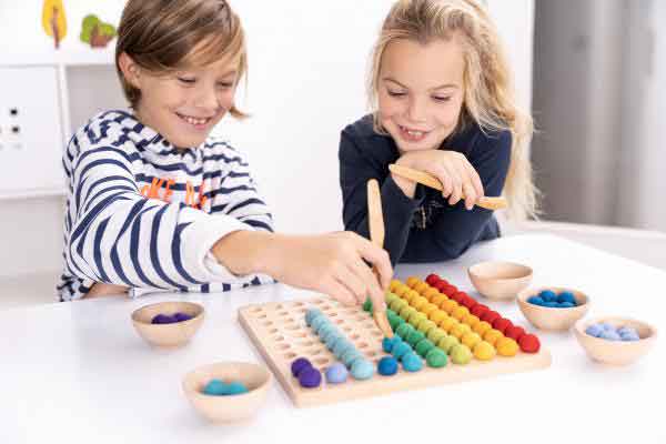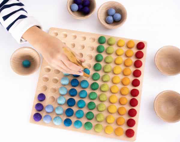Legebrett aus Holz zum Sortieren und Rechnen. 10 x 10 Vertiefungen, die z.B. mit Filzkugeln, Murmeln oder Perlen gefüllt werden können.