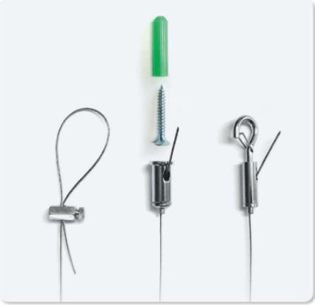 Im Set enthalten: 2 Seile a. 100 cm, 2 Seile a. 20 cm, 4 Schrauben für die Platte, 3 verschiedene Befestigungsmöglichkeiten - 2 Haken - 2 Sechskantspanner - 2 Schlaufenspanner