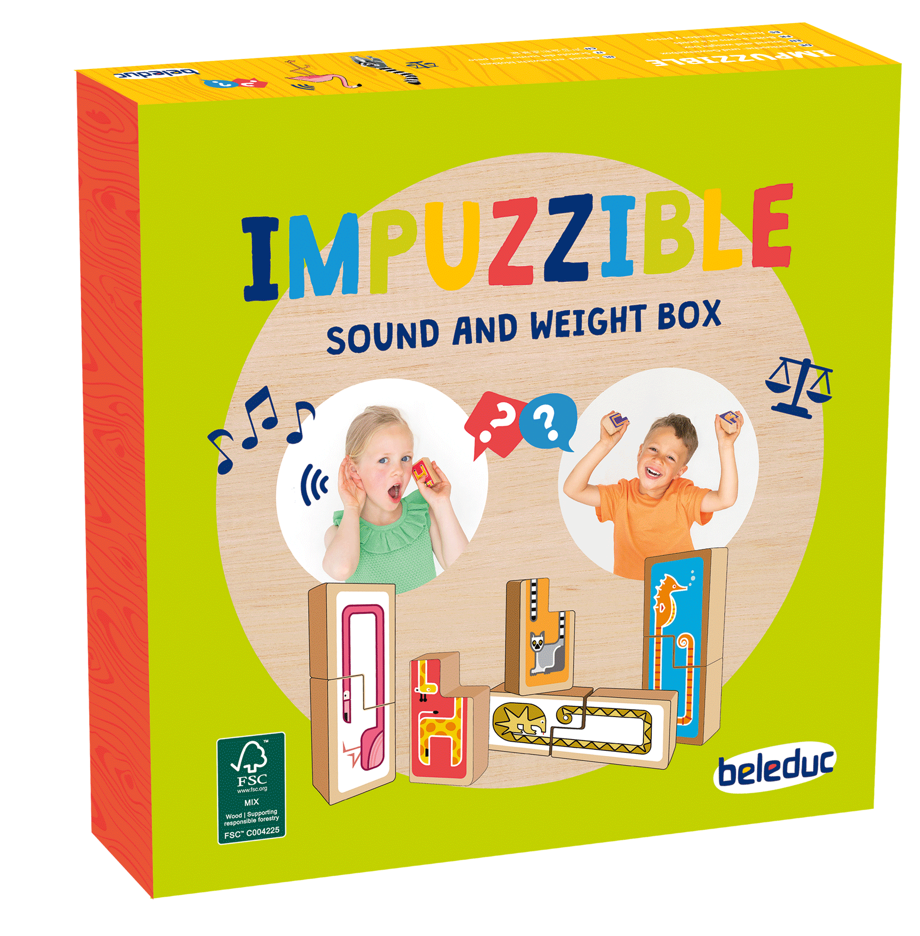Finde die passenden Paare anhand des Gewichts oder des Geräusches und puzzle das Pärchen zusammen. So entstehen lustige Tiere! Mit Impuzzible wird das Gehör und die Konzentration ganz besonders gefördert, wobei der Spaß im Vordergrund steht! Die Box überzeugt durch ein innovatives Konzept und eine sehr moderne und ansprechende Tier-Illustration. Bei den Gewichten ist natürlich der Elefant am schwersten und das kleine Katta am leichtesten.